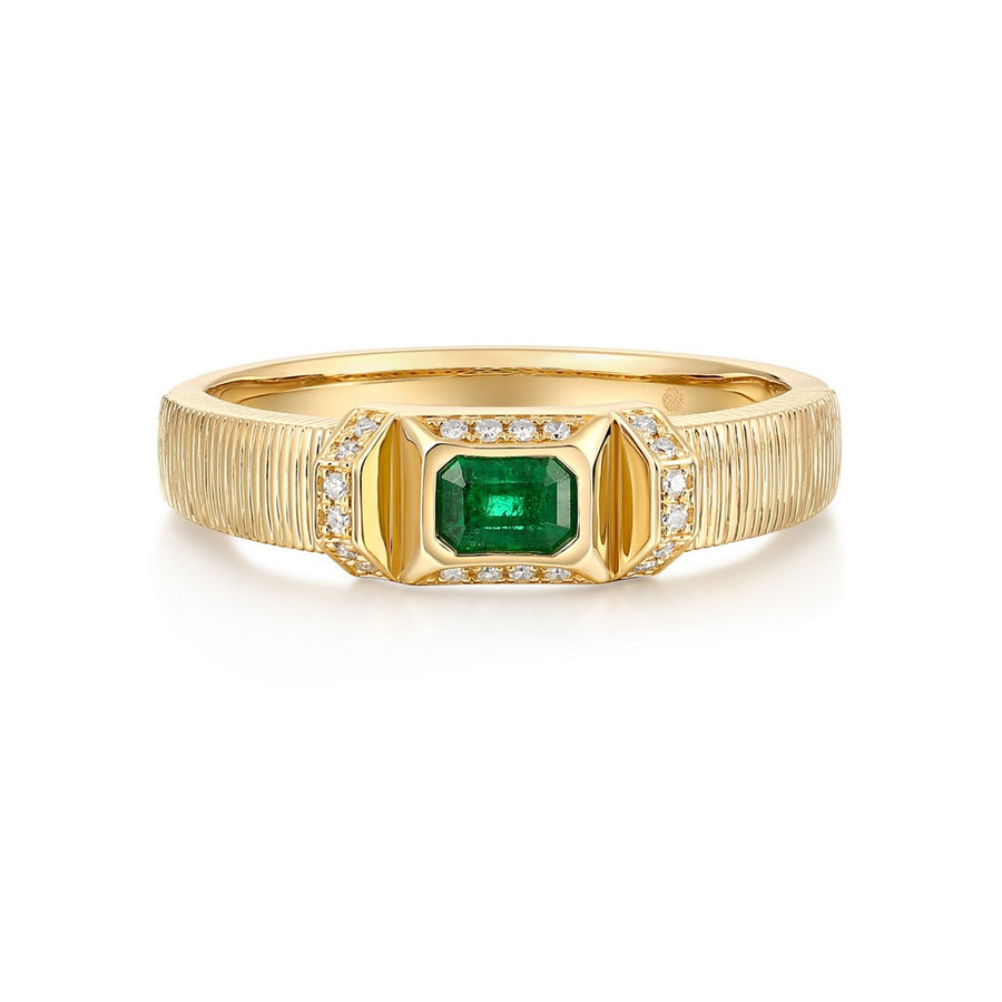 14K Yellow Gold 0.25 CT Emerald & 0.05 CTW Diamond Ridged Band Ring