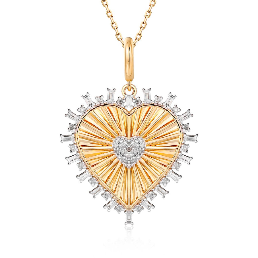 Sunburst Heart Diamond Pendant with Baguette Halo in 14K Gold