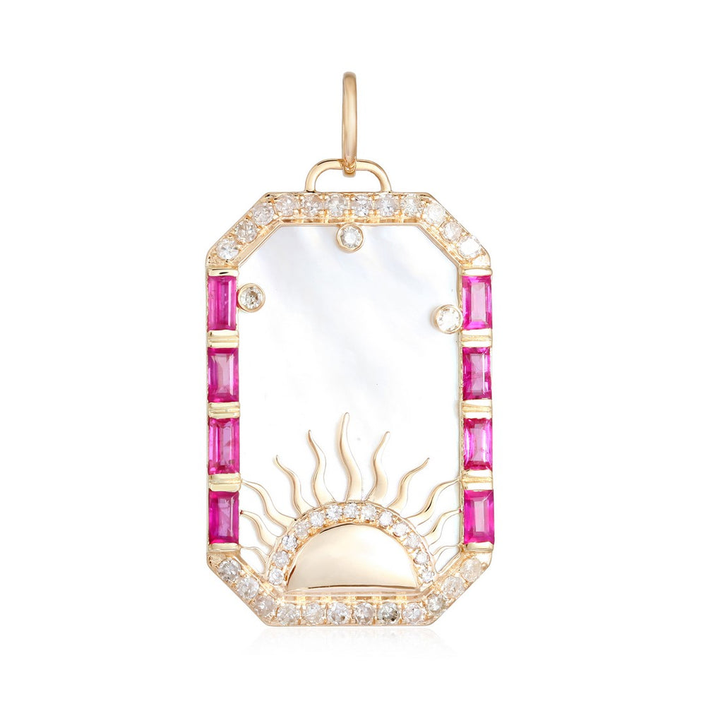 14K Yellow Gold Mother-of-Pearl Sunburst Pendant with Blue Sapphires & Diamond Halo