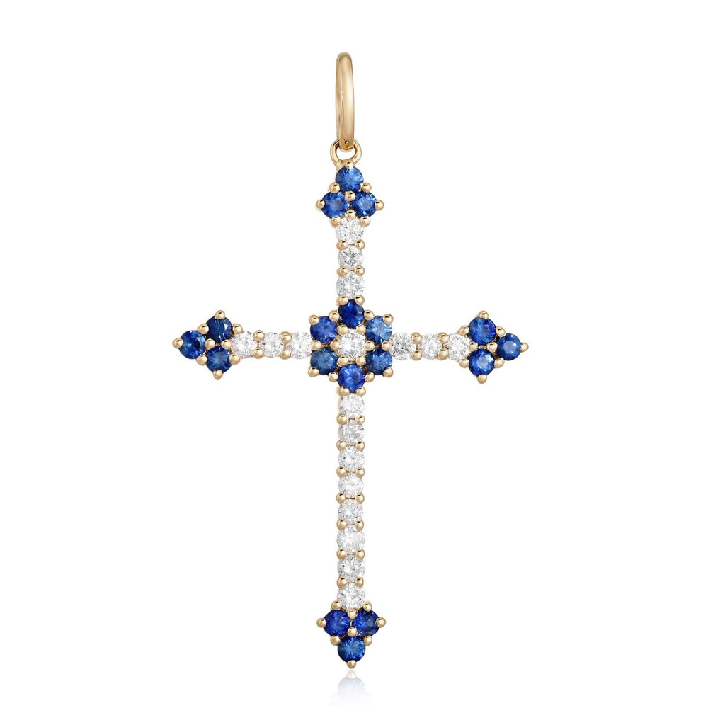 14K Yellow Gold Diamond & Blue Sapphire Cross Pendant
