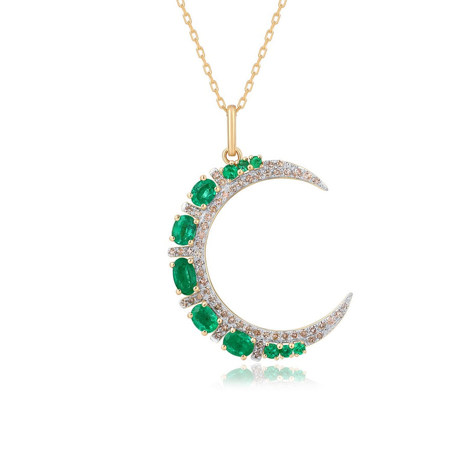 Emerald Crescent Moon Diamond Pendant in 14K Gold